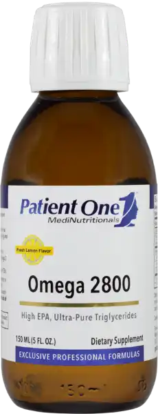 Patient One Omega 2800 supplies highly purified and concentrated Omega-3 fatty acids as triglycerides in a liquid delivery system. Omega 2800 is formulated in a high EPA (eicosapentaenoic acid) to DHA (docosahexaenoic acid) ratio, and also includes a proprietary antioxidant blend.